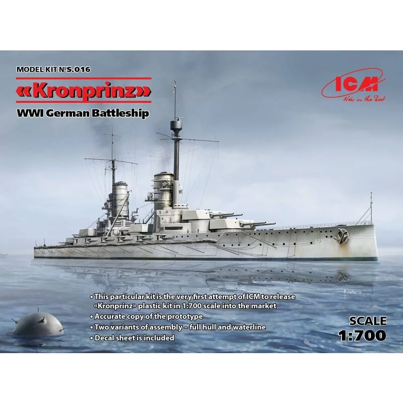 Kronprinz (pleine coque et ligne de flottaison), la Première Guerre mondiale allemande Battleship Ce kit particulier est la première tentative de l’ICM pour libérer « kit plastique Kronprinz en 1: 700 échelle dans la copie marketAccurate des variantes de prototypeTwo de coque-assemblage complet et la feuille waterlineDecal est inclus