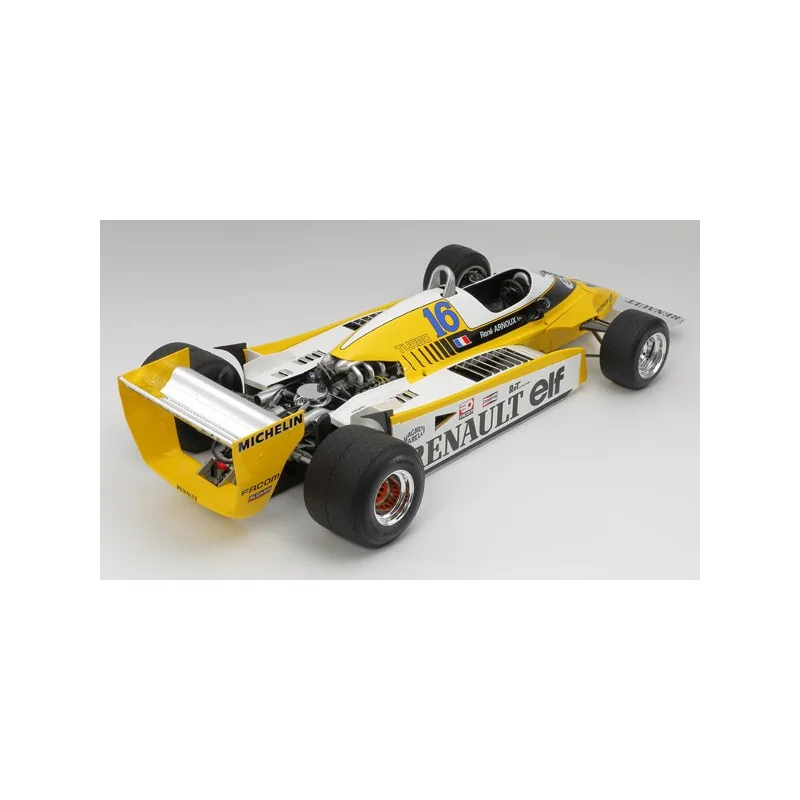 Réédition de la réf.12033 (première sortie en 2006) avec de nouveaux decals Cartograf et guide de décoration. En 1977 apparut en compétition la première Formule 1 à moteur turbo, la RS-01 de Renault et en 1979 la RS-10 remporta sa première victoire au Grand Prix de France. Conçue pour la saison 1980, la RE-20 était une version modifiée de la RS-10 avec un poids réduit de 30kg et un moteur V6 1,5 litres DACT biturbo développant 520ch. La réussite fut immédiate pour la RE 20 et son duo de pilotes français, Jean-Pierre Jabouille décrochant la pole position lors des deuxième et troisième grands prix au Brésil et en Afrique du Sud, bien que le vainqueur de ces deux courses soit son coéquipier René Arnoux ; Jabouille s’imposera finalement lors de la dixième manche en Autriche.