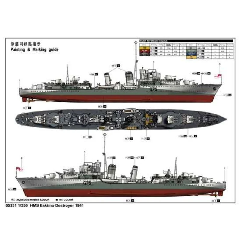 HMS Eskimo Destroyer 1941Echelle 1:350Maquette statiqueDimensions : Longueur : 328.3mm Largeur :15.8 mmNombre de pièces : 250+Pièces photo-découpées : 1 plancheNombre de grappes : 7 grappes + coqueInfos complémentaires:Maquette à assembler composée de plus de 250 pièces,incluant des pièces photo-découpéesCoque moulée à l’aide d’un moule à tiroirsSupport inclus