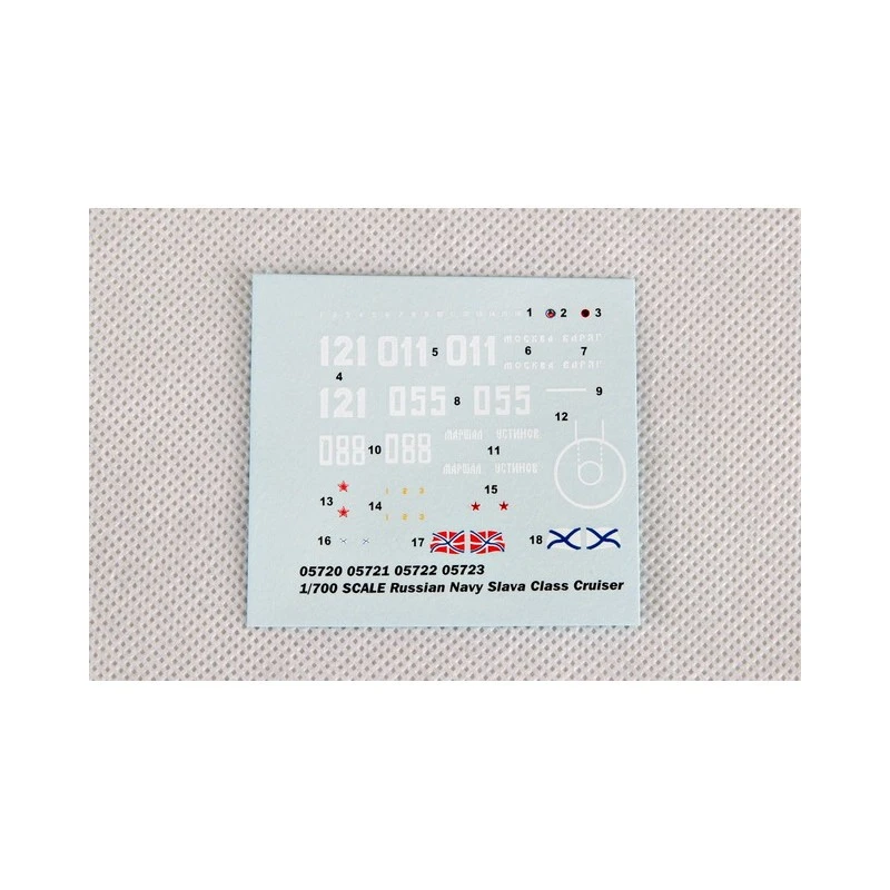 Contient : une feuille de décalcomanie pour les 3 navires : Moskva, Varyag et Marshal Ustinov