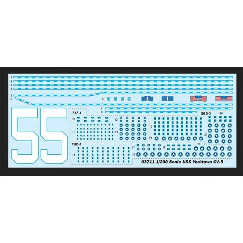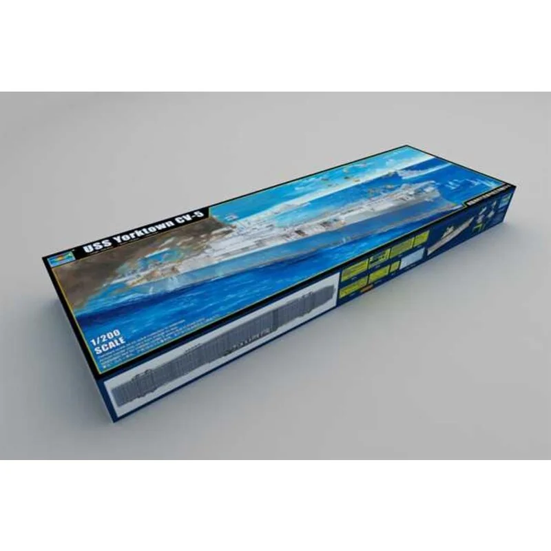 Yorktown CV-5Echelle : 1:200 Maquette plastique à assembler et à peindreDimensions : Longueur : 1245.5mm, largeur : 179.8mmNombre de pièces : 1120+Pièces métal : chaine d’ancrePièces photo-découpées : 8 planchesNombre de grappes : 44 grappes, coque et pontsInfos complémentaires :Coque moulée en une seule pièce à l’aide d’un moule à tiroirsSurface des ponts fidèlement reproduiteCanon très détailléDe très nombreuses pièces photo-découpées, rambardes, échelles,éléments du radar, etc.Avions : F4F-4×5, SBD-3×5, TBD-1×5